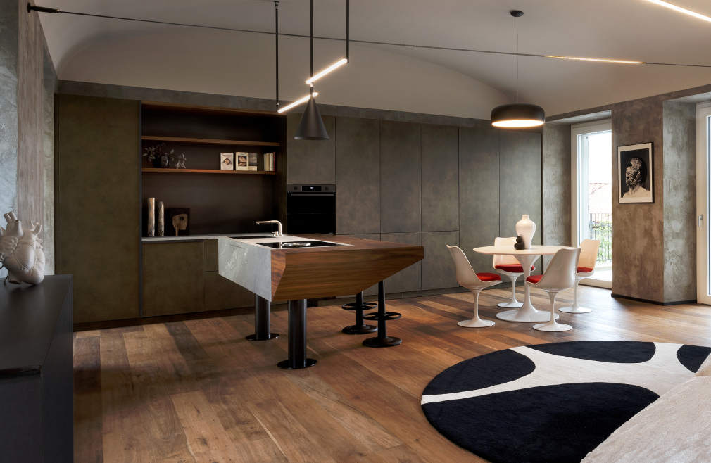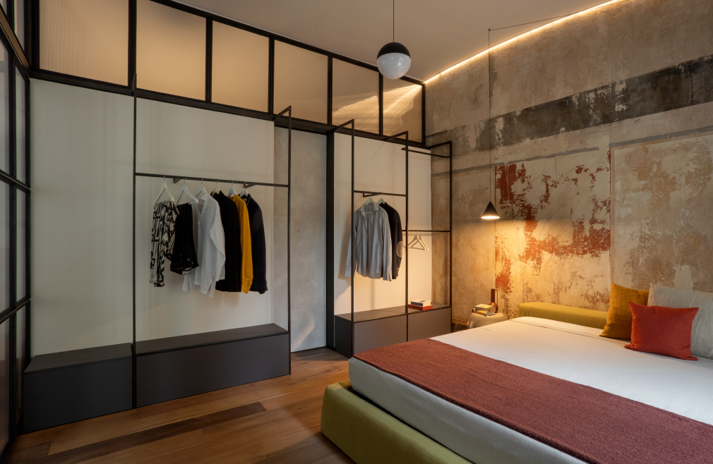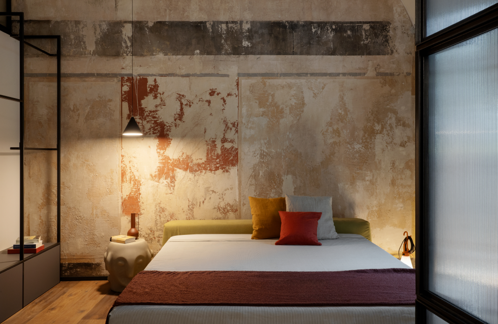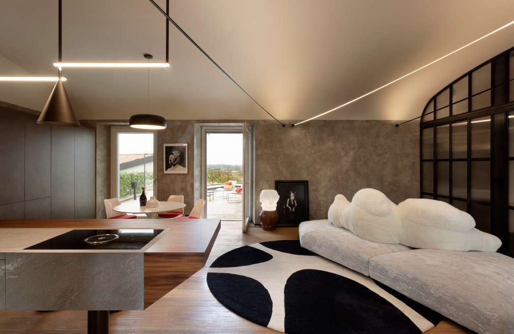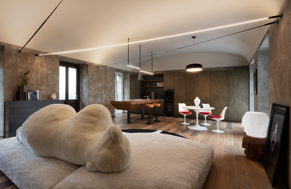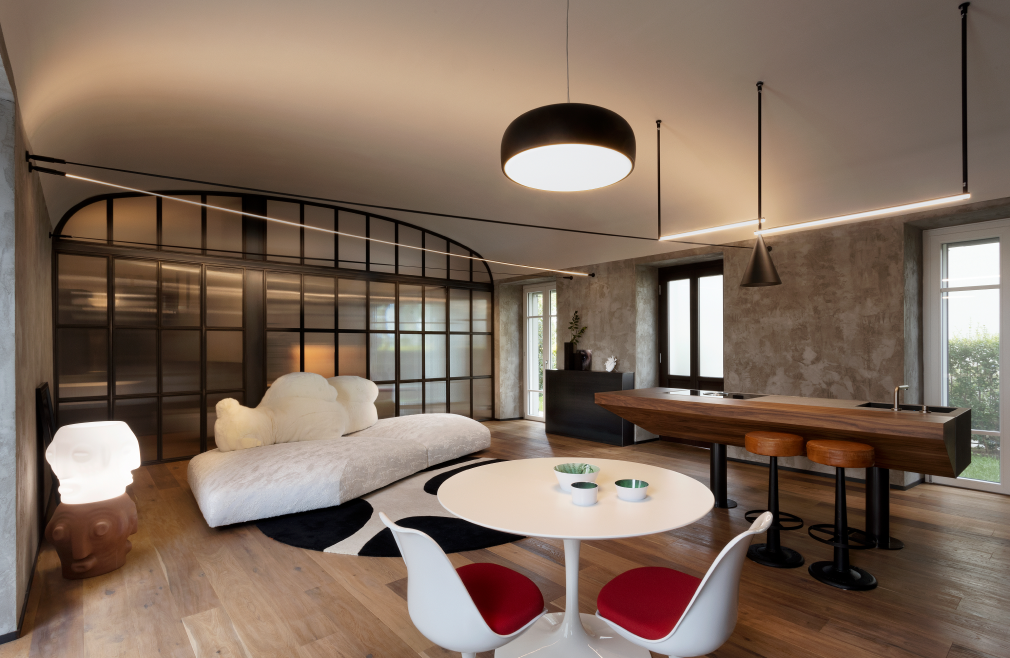 Tra le colline torinesi, un loft al piano terra di una villa seicentesca — un tempo convento — diventa il luogo in cui storia e design si incontrano in un racconto di equilibrio e carattere. L'intervento di riqualificazione, firmato FL architetti, ha preservato l’identità architettonica originaria, esaltando la struttura storica con dettagli dal segno industriale: la parete in ferro nero e vetro millerighe, i supporti metallici a vista, il pavimento in rovere naturale e le finiture in cemento definiscono un ambiente autentico e rigoroso, capace di far convivere memoria e contemporaneità.