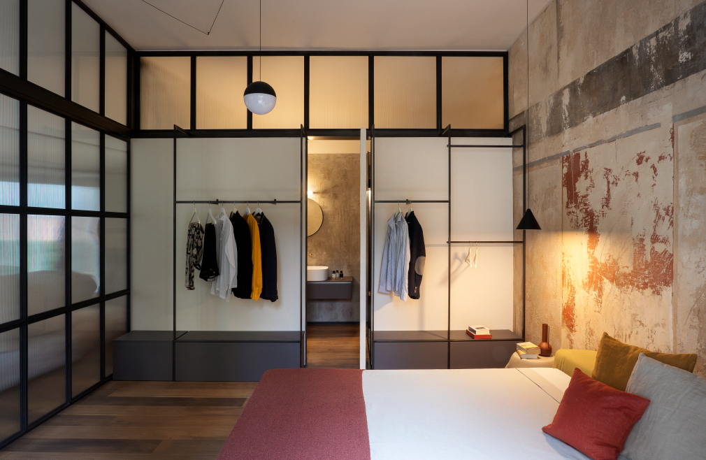 Per il bagno, FL architetti scelgono la rubinetteria Geda, in particolare la serie Koè, per il suo design distintivo e al tempo stesso perfettamente in linea con le scelte progettuali del loft. Il design, ispirato al mondo industriale — riconoscibile nelle maniglie che richiamano leve di valvole — dialoga con le texture naturali e le superfici grezze dell’ambiente, creando un equilibrio raffinato e caloroso. La scelta della finitura in ottone satinato definisce l’atmosfera dello spazio: un metallo caldo, privo di riflessi, capace di creare un dialogo equilibrato tra la forza industriale della struttura e la delicatezza delle superfici naturali, mentre l’illuminazione calda ne esalta la resa materica. La composizione si completa con il lavabo a muro, il set doccia con soffione tondo, la doccetta e la cascata a incasso e il miscelatore bidet. Un insieme coerente che si integra con la luce calda e con la palette cromatica del progetto, restituendo un ambiente intimo, essenziale e di grande forza espressiva.