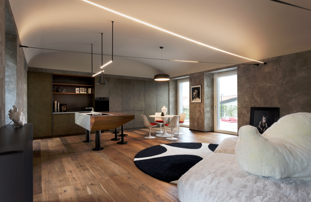 Tra le colline torinesi, un loft al piano terra di una villa seicentesca — un tempo convento — diventa il luogo in cui storia e design si incontrano in un racconto di equilibrio e carattere. L'intervento di riqualificazione, firmato FL architetti, ha preservato l’identità architettonica originaria, esaltando la struttura storica con dettagli dal segno industriale: la parete in ferro nero e vetro millerighe, i supporti metallici a vista, il pavimento in rovere naturale e le finiture in cemento definiscono un ambiente autentico e rigoroso, capace di far convivere memoria e contemporaneità.