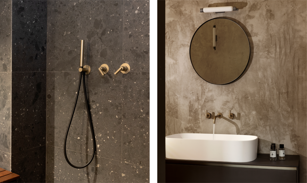 Per il bagno, FL architetti scelgono la rubinetteria Geda, in particolare la serie Koè, per il suo design distintivo e al tempo stesso perfettamente in linea con le scelte progettuali del loft. Il design, ispirato al mondo industriale — riconoscibile nelle maniglie che richiamano leve di valvole — dialoga con le texture naturali e le superfici grezze dell’ambiente, creando un equilibrio raffinato e caloroso. La scelta della finitura in ottone satinato definisce l’atmosfera dello spazio: un metallo caldo, privo di riflessi, capace di creare un dialogo equilibrato tra la forza industriale della struttura e la delicatezza delle superfici naturali, mentre l’illuminazione calda ne esalta la resa materica. La composizione si completa con il lavabo a muro, il set doccia con soffione tondo, la doccetta e la cascata a incasso e il miscelatore bidet. Un insieme coerente che si integra con la luce calda e con la palette cromatica del progetto, restituendo un ambiente intimo, essenziale e di grande forza espressiva.
